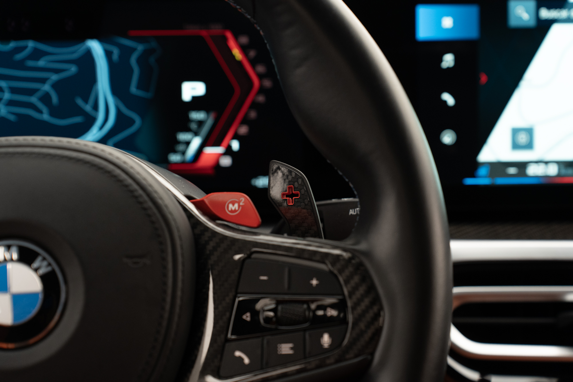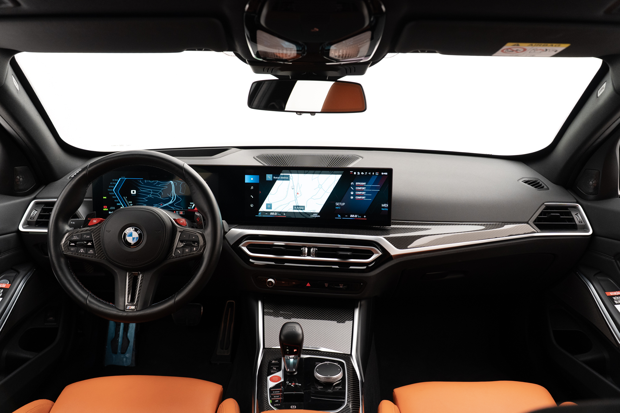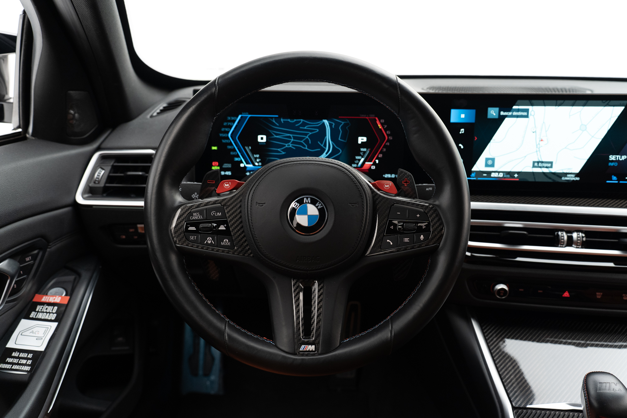 Volante multifuncional com seletor de modos M1 e M2, paddle shift e acabamentos em Fibra de Carbono
