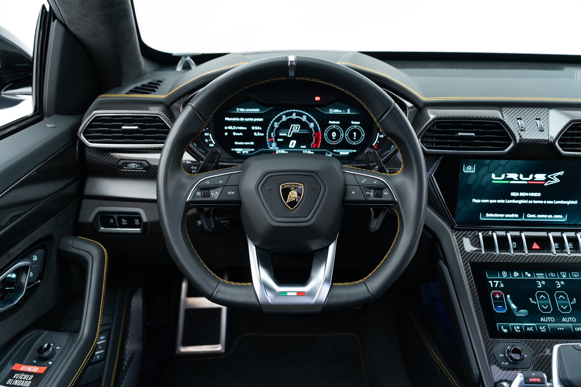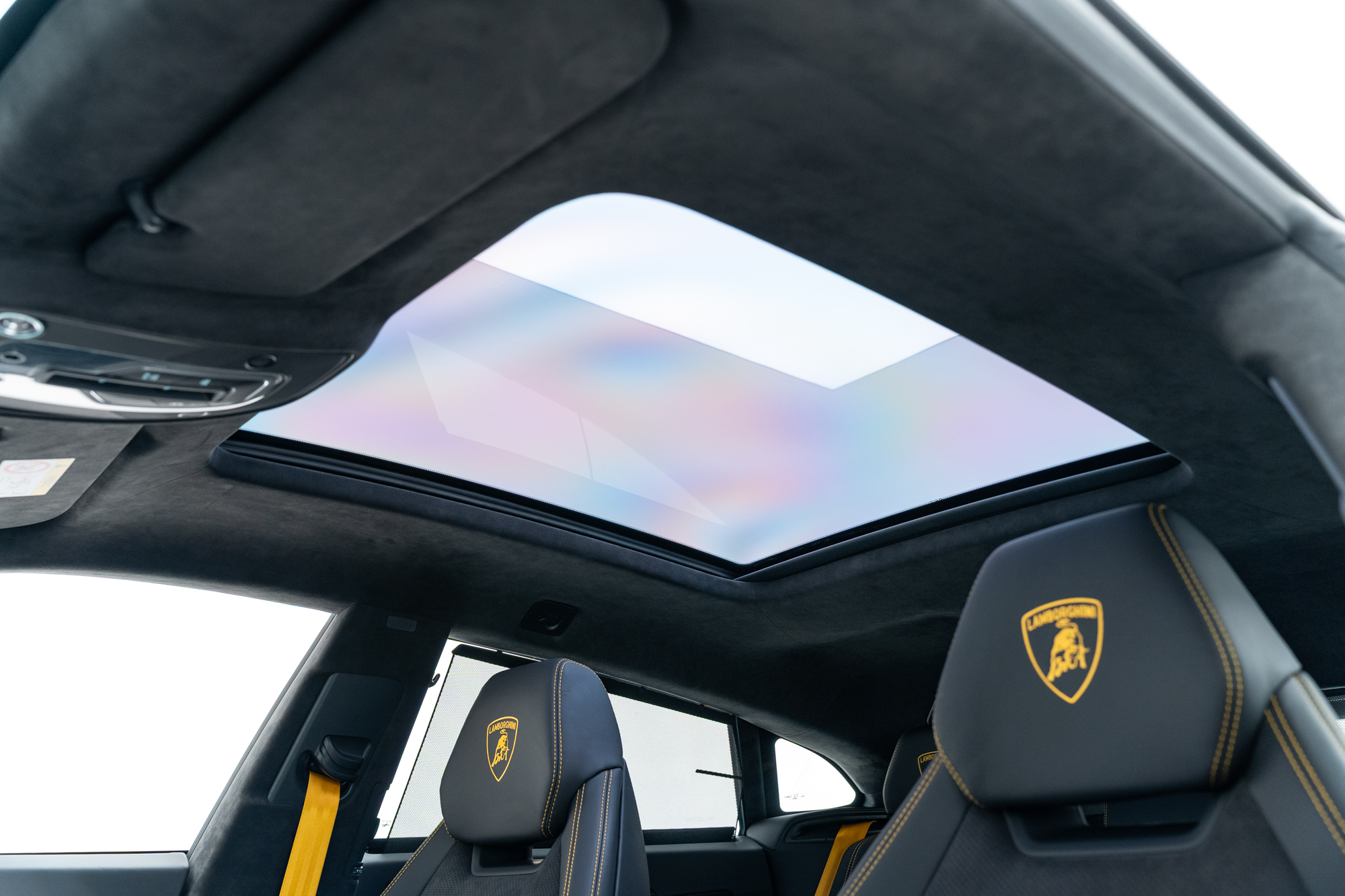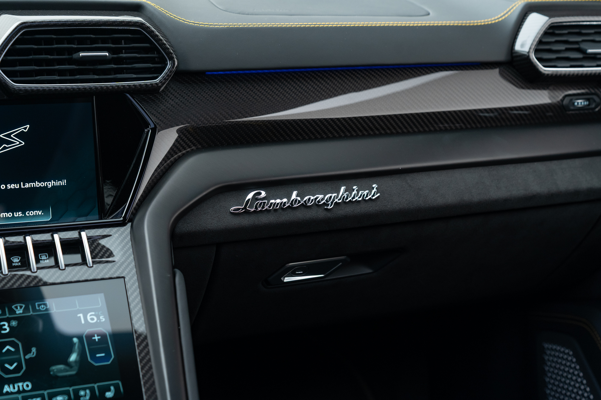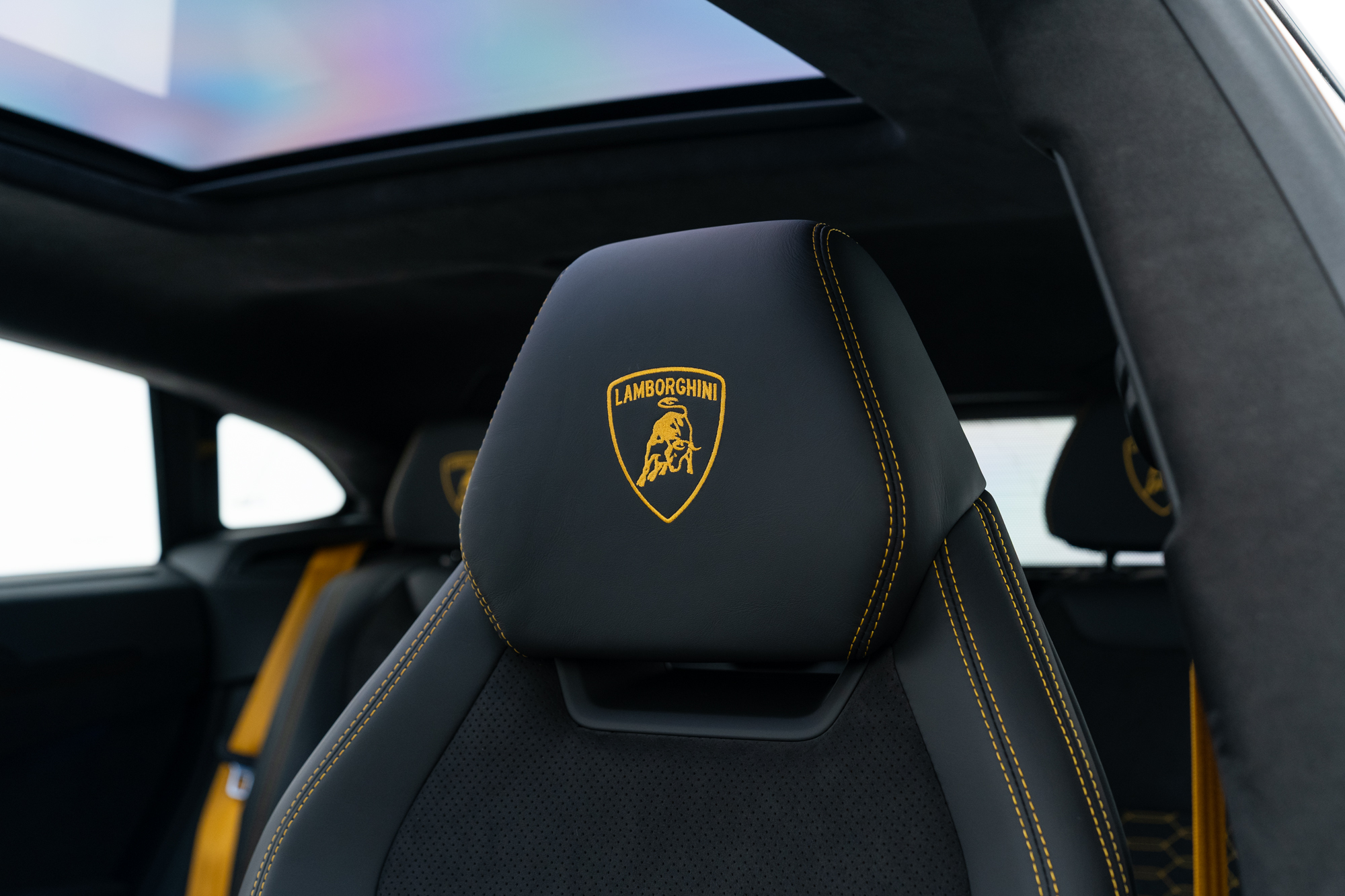 Logo Lamborghini grafado nos encostos de cabeça dos bancos