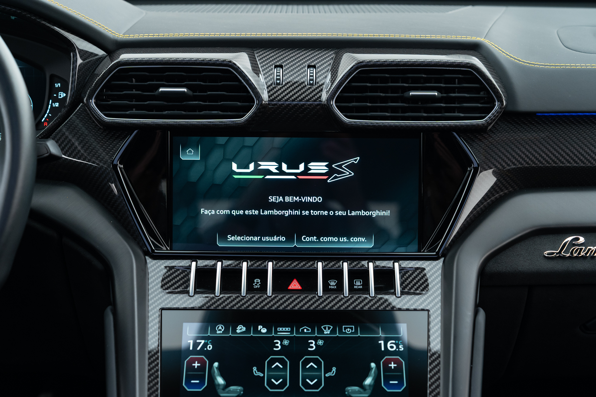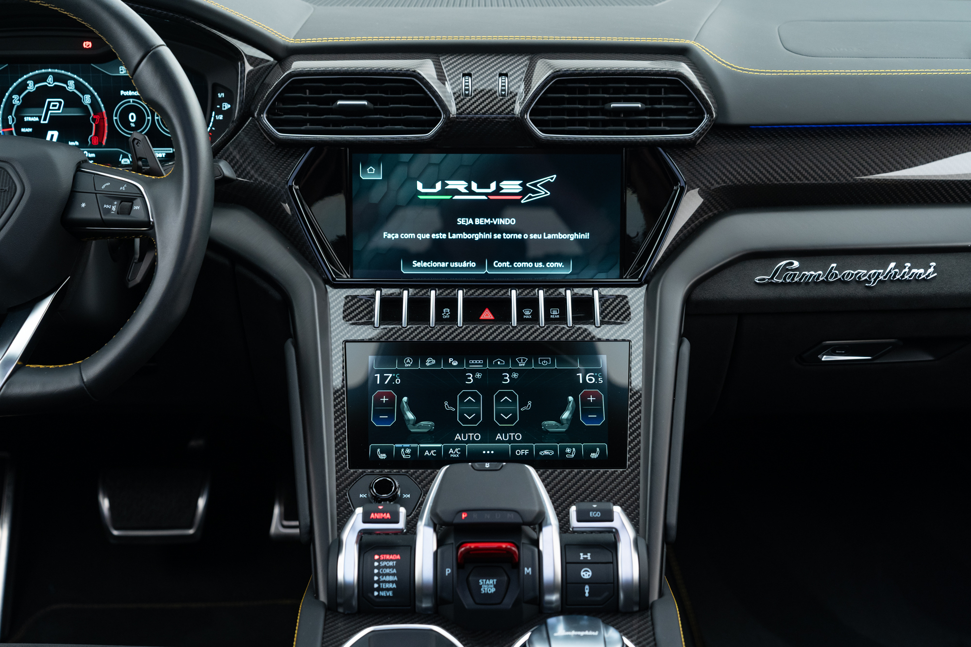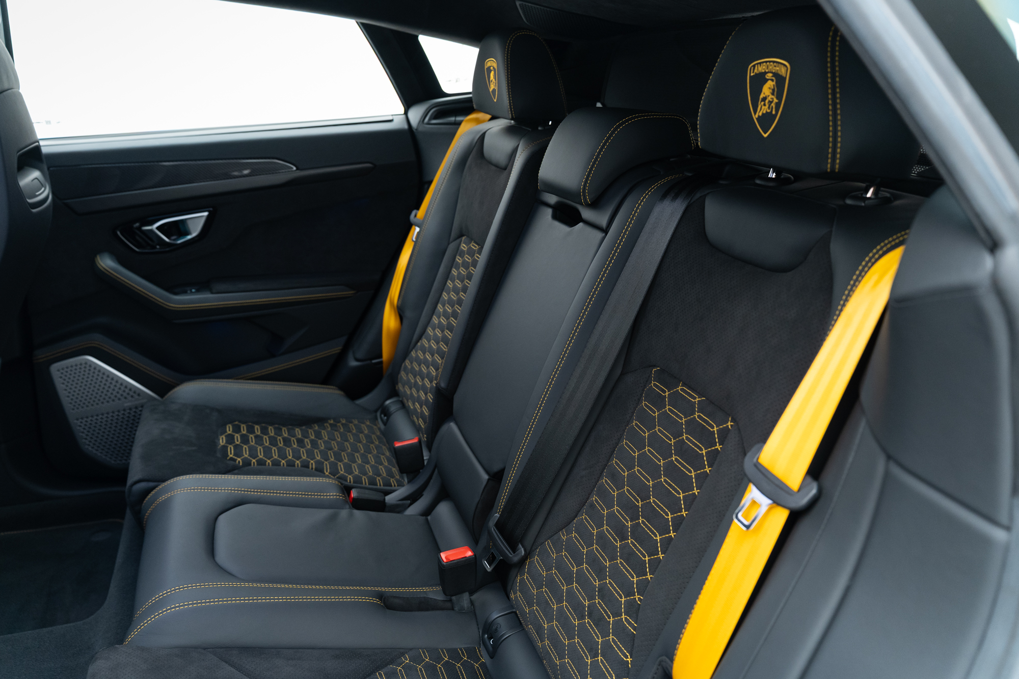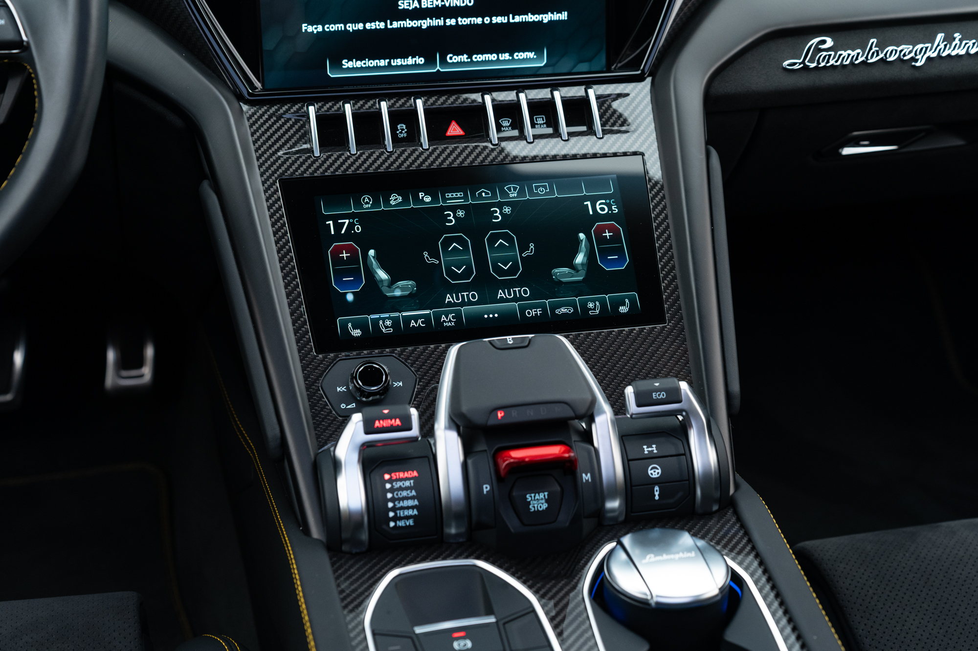 Logo Lamborghini grafado nos encostos de cabeça dos bancos