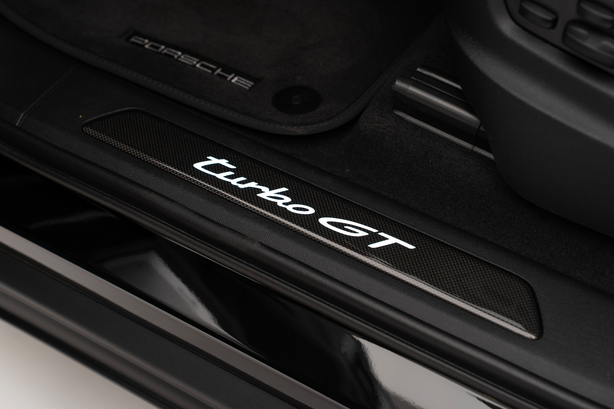 Soleira em carbono com inscrição "TURBO GT" iluminada