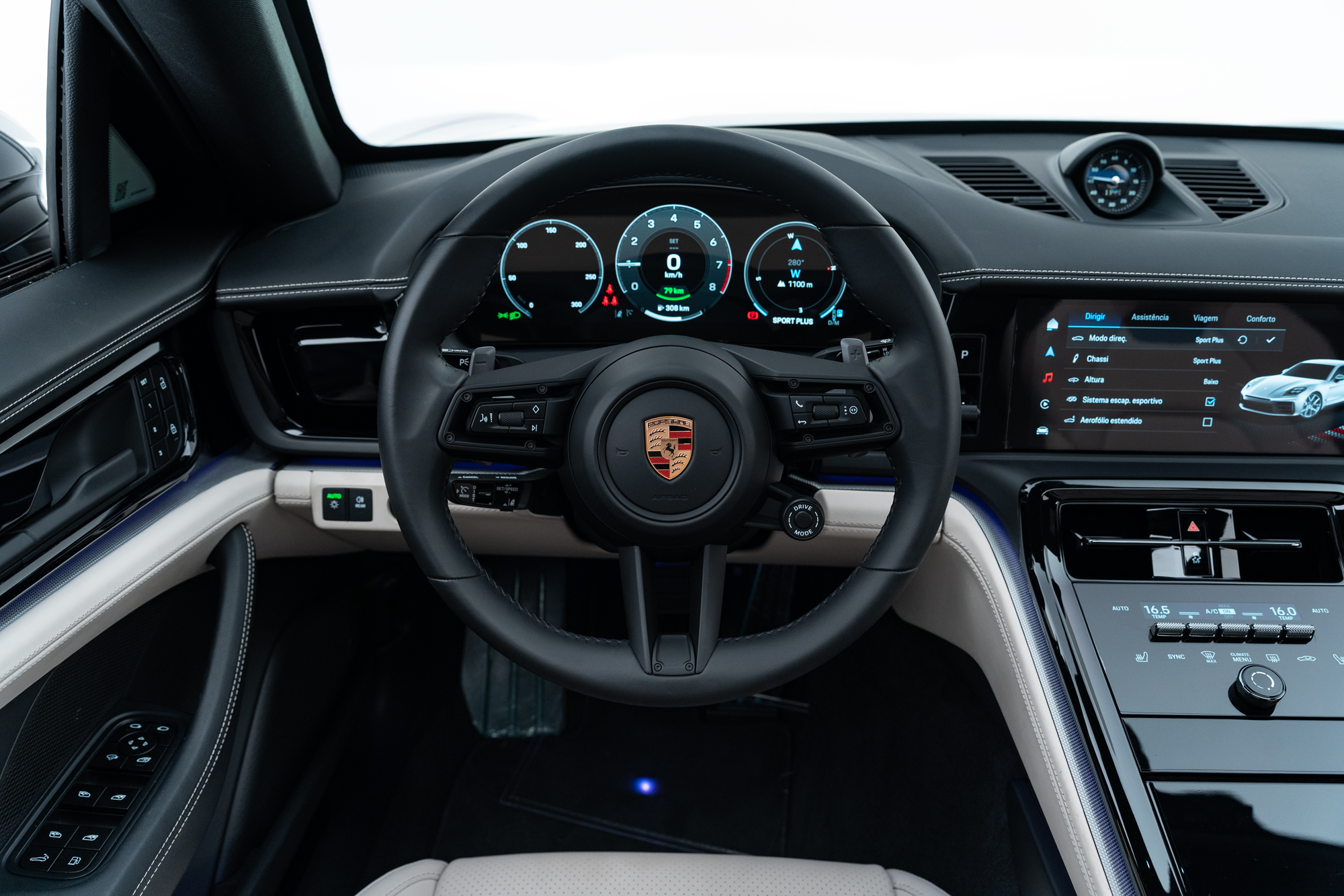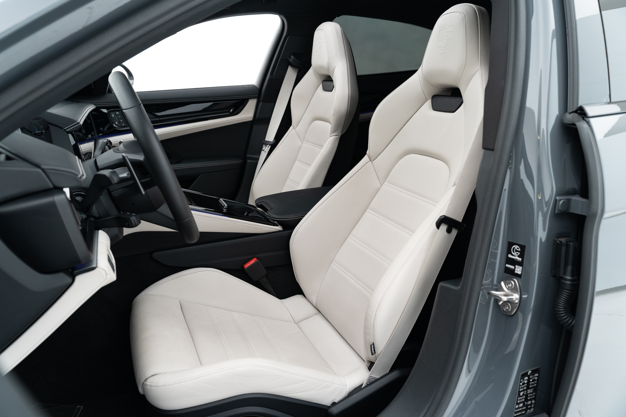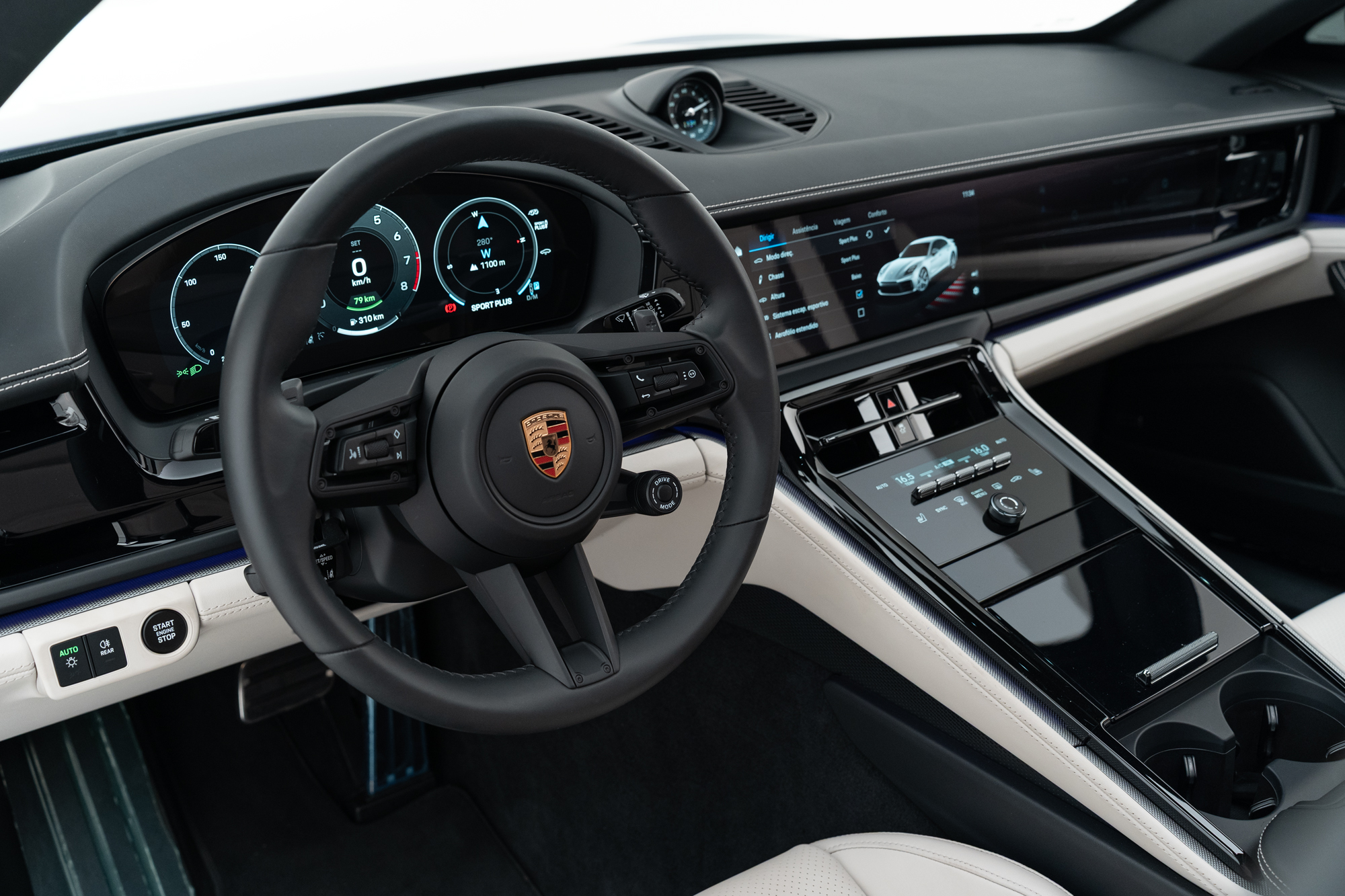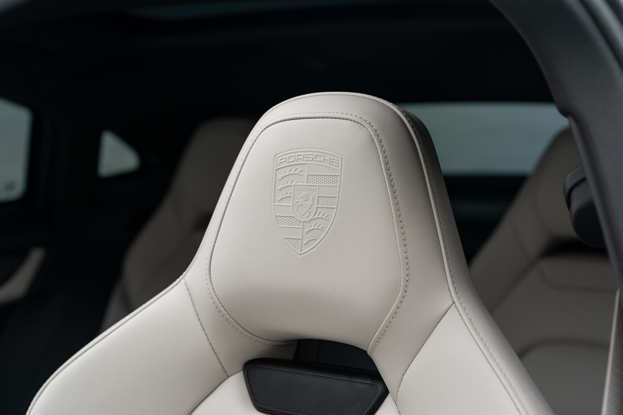 Escudos Porsche grafado nos encostos de cabeça dos bancos